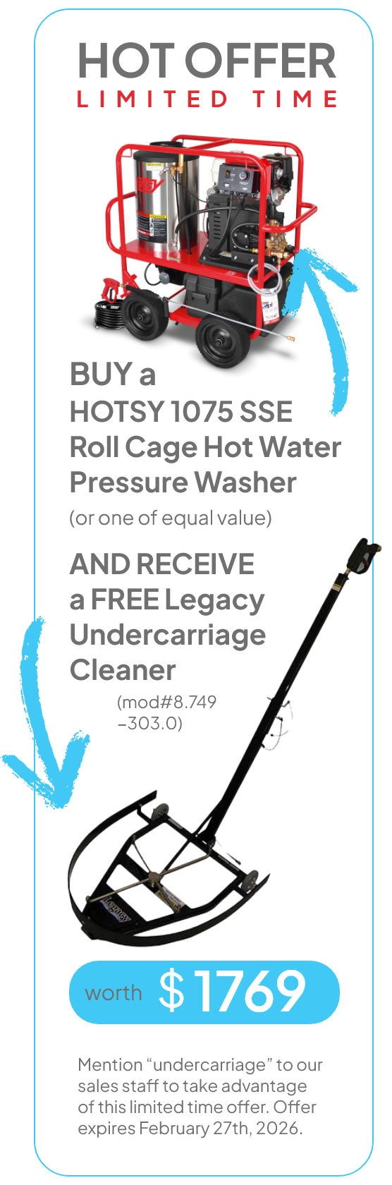 Call or contact us to learn more about the right undercarriage washer, cleaner and accessories for your pressure washer so you can stop undercarriage corrosion in its tracks!